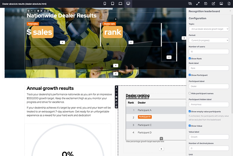 Create and build screens code-free by dropping in both static and functional components, supported by comprehensive features to configure components.